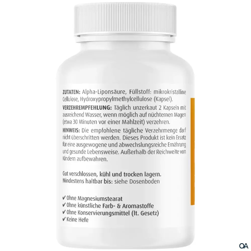 - Zutaten: Alpha-Liponsäure, Hydroxypropylmethylcellulose (Kapsel).