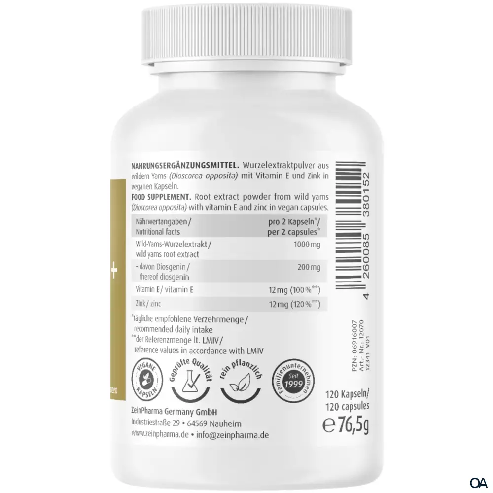 - Nährwertangaben pro 2 Kapseln*: Wild Yams Wurzelextrakt 1000 mg - davon Diosgenin 200 mg, Vitamin E 12 mg (100 %**), Zink 12 mg (120 %**). * tägliche empfohlene Verzehrmenge. ** der Referenzmenge lt. LMIV.