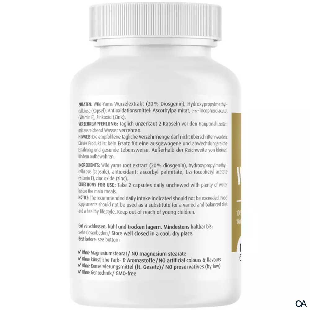 - Zutaten: Wild-Yams-Wurzelextrakt (20 % Diosgenin), Hydroxypropylmethylcellulose (Kapsel), Antioxidationsmittel: Ascorbylpalmitat, L-α-Tocopherolacetat (Vitamin E), Zinkoxid (Zink).