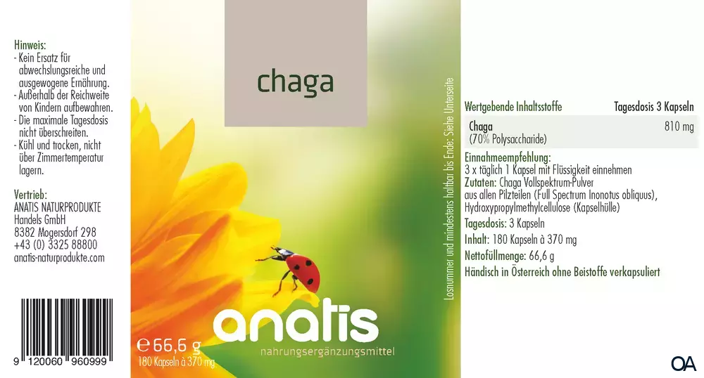 anatis Chaga Pilz Kapseln ist ein Nahrungsergänzungsmittel bestehend aus 270 mg Inonotus obliquus pro Kapsel. Mit mehr als 70 % Polysaccharide.