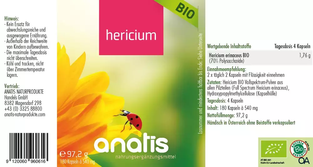 anatis Hericium Pilz BIO Kapseln ist ein Nahrungsergänzungsmittel bestehend aus Hericium erinaceus Pilz in Bio-Qualität auf Nährböden gezüchtet. Vollspektrum-Pulver aus allen Pilzteilen.
