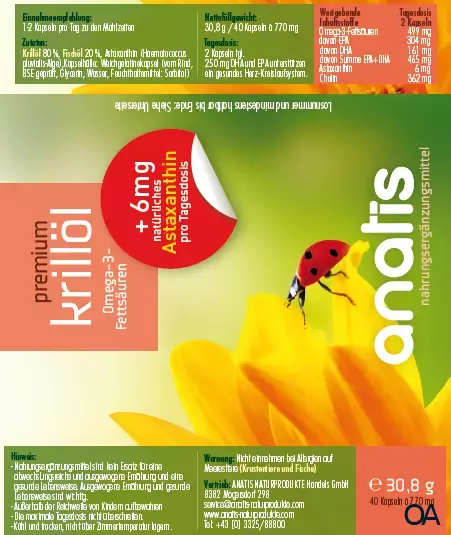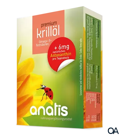 anatis Krillöl premium Kapseln ist ein Nahrungsergänzungsmittel bestehend aus 450 mg Omega-3-Fettsäuren (EPA/DHA) und 6 mg Astaxanthin.