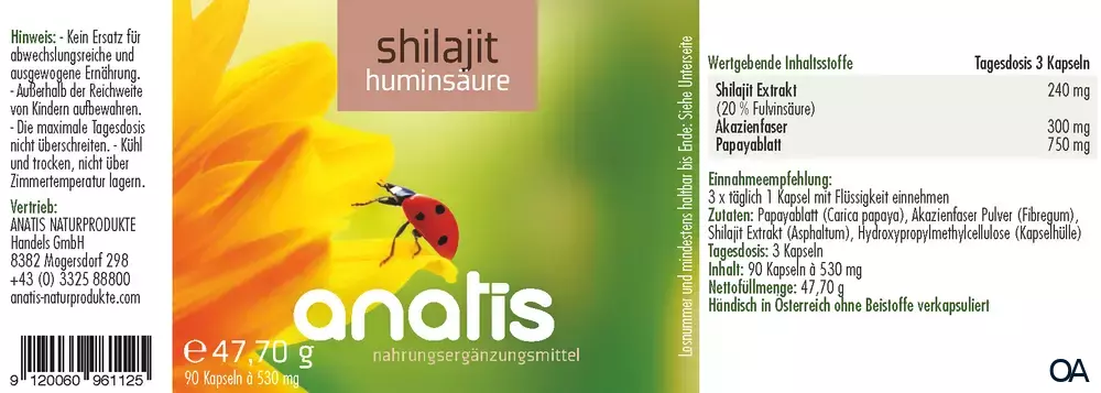 - Wertgebende Inhaltsstoffe Tagesdosis 3 Kapseln: Shilajit Extrakt (20 % Fulvinsäure) 240 mg, Akazienfaser 300 mg, Papayablatt 750 mg