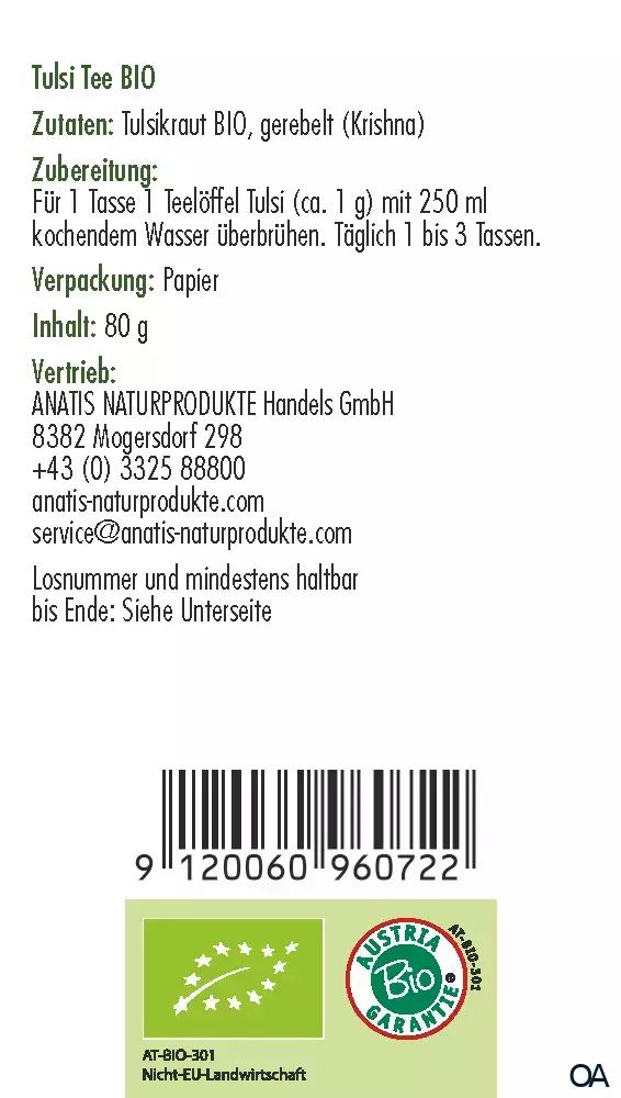 anatis Tulsi Tee BIO besteht aus dem gerebelten Tulsi Basilikumblatt der Sorte Krishna aus Bio-Anbau.