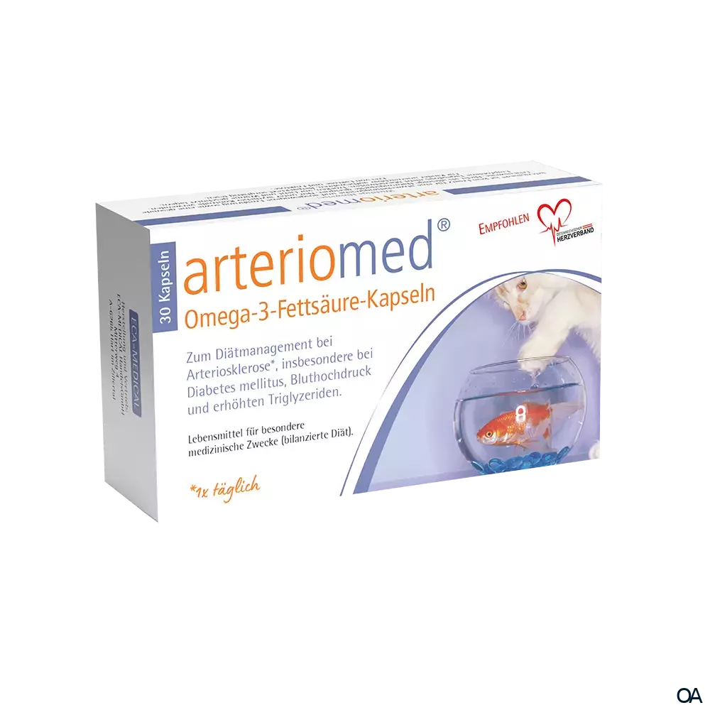 arteriomed® Omega-3-Fettsäure-Kapseln dienen zur diätetischen Behandlung von Arteriosklerose, insbesondere bei Diabetes mellitus, Bluthochdruck und erhöhten Triglyceriden.