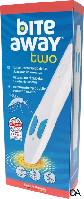 bite away® two ist ein thermotherapeutisches  Medizinprodukt zur topischen symptomatischen Behandlung von Juckreiz und Schmerzen verursacht durch Insektenstiche und -bisse, wie z. B. von Mücken, Wespen, Bienen, Hornissen oder Bremsen. Bei sofortiger Anwendung nach dem Stich/Biss können die Symptome in der Regel ganz verhindert werden, daher sollte die Behandlung der betroffenen Körperstelle so schnell wie möglich erfolgen. Auch bei späterer Anwendung können Begleitsymptome wie Juckreiz und Schmerzen  effektiv gelindert werden und schneller abklingen.