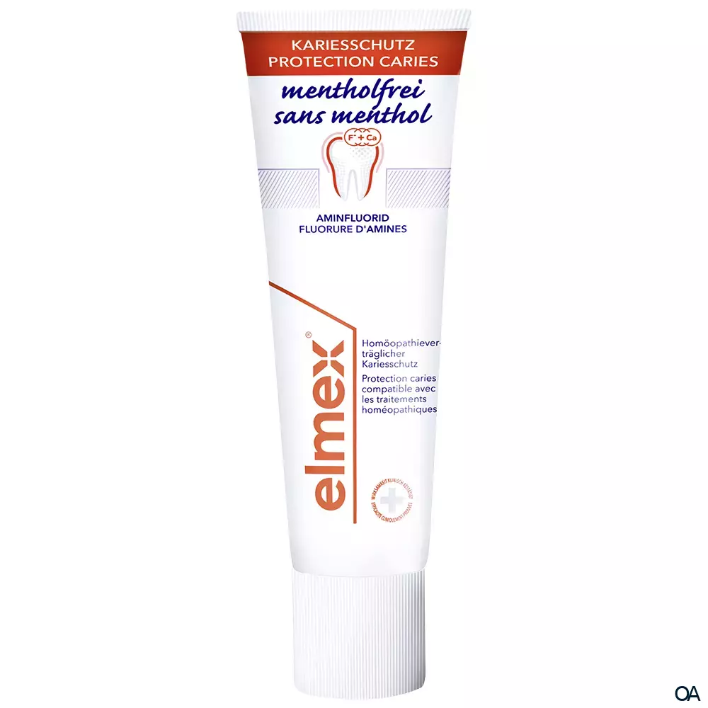 elmex® mentholfrei bietet die optimale, homöopathieverträgliche Kariesprophylaxe für die bleibenden Zähne. Während einer homöopathischen Behandlung sollte auf ätherische Öle verzichten werden. Vor diesem Hintergrund wurde von elmex® eine medizinische Spezial-Zahnpasta entwickelt: elmex® mentholfrei. Die Zahnpasta enthält keine ätherischen Öle (wie Pfefferminze und Menthol) und ist daher auch für Allergiker geeignet. Das organische Aminfluorid (1250 ppm Fluorid) sorgt für zuverlässigen Kariesschutz.