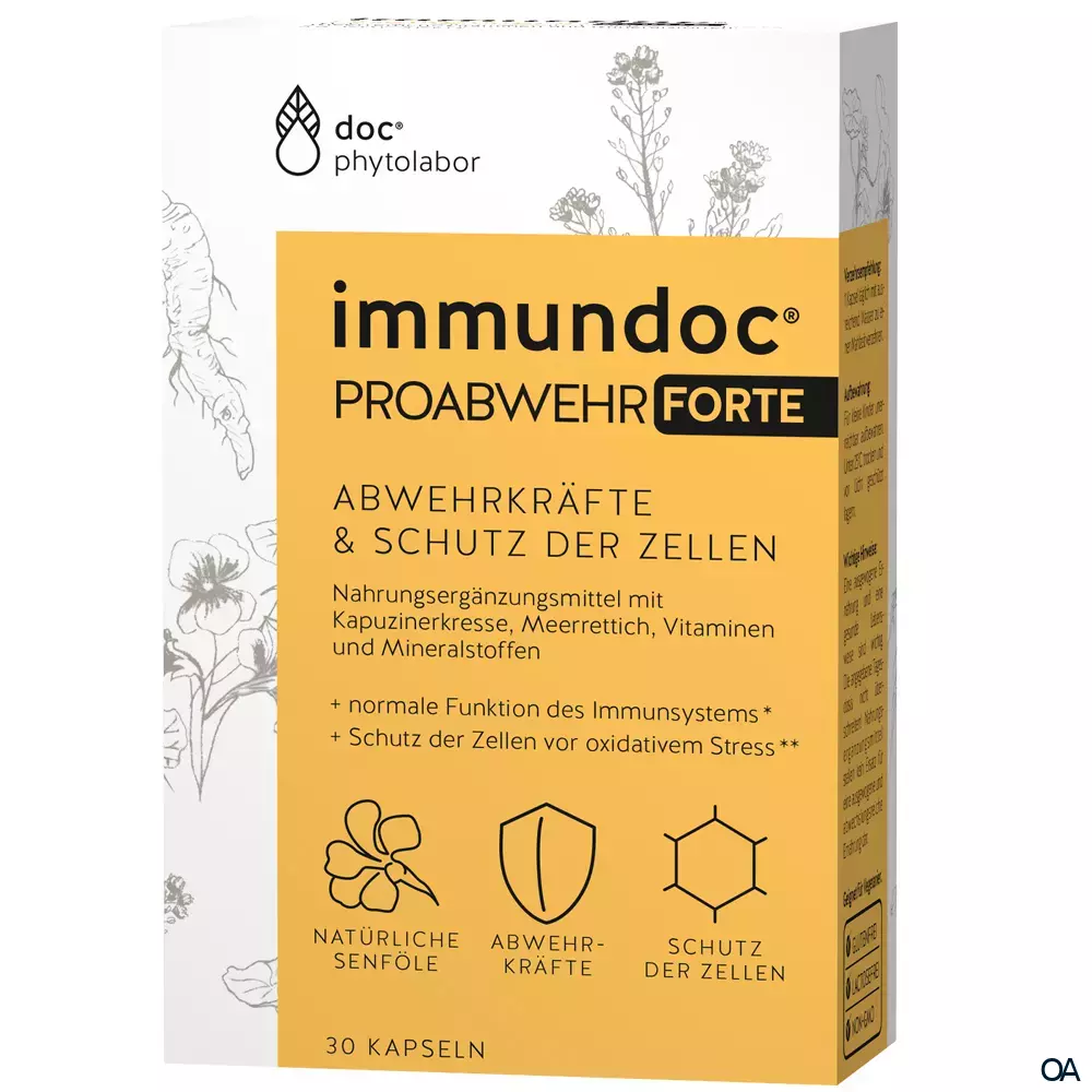 immundoc® PROABWEHR FORTE Kapseln - Abwehrkräfte & Schutz der Zellen. Nahrungsergänzungsmittel mit Kapuzinerkresse, Meerrettich, Vitaminen und Mineralstoffen.immundoc® PROABWEHR FORTE Kapseln enthalten eine Pflanzenkombination aus Kapuzinerkresse und Meerrettichwurzel. Das enthaltene Rutin aus Sophora japonica fördert die Aufnahme des in immundoc enthaltenen hochdosierten Vitamin C, das zu einer normalen Funktion des Immunsystems beiträgt.