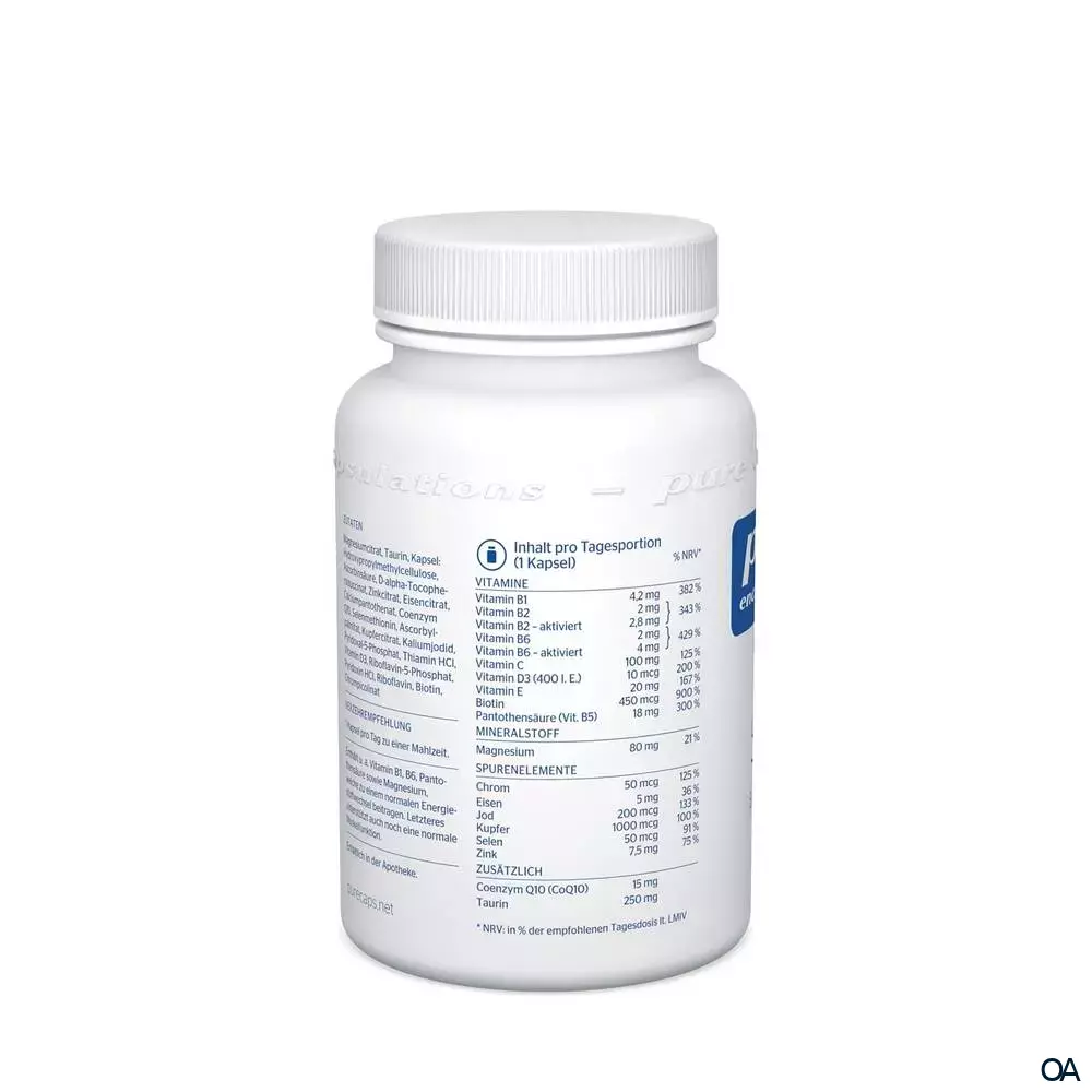 Inhalt pro Tagesportion (1 Kapsel) Vitamine Vitamin B1 4,2 mg Vitamin B2 2 mg Vitamin B2 – aktiviert 2,8 mg Vitamin B6 2 mg Vitamin B6 – aktiviert 4 mg Vitamin C 100 mg Vitamin D3 (400 I.E.) 10 mcg Vitamin E (30 I.E.) 20 mg Biotin 450 mcg Pantothensäure (Vitamin B5) 18 mg Mineralstoff Magnesium 80 mg Spurenelemente Chrom 50 mcg Eisen 5 mg Jod 200 mcg Kupfer 1000 mcg Selen 50 mcg Zink 7,5 mg Zusätzlich Coenzym Q10 (CoQ10) 15 mg Taurin 250 mg