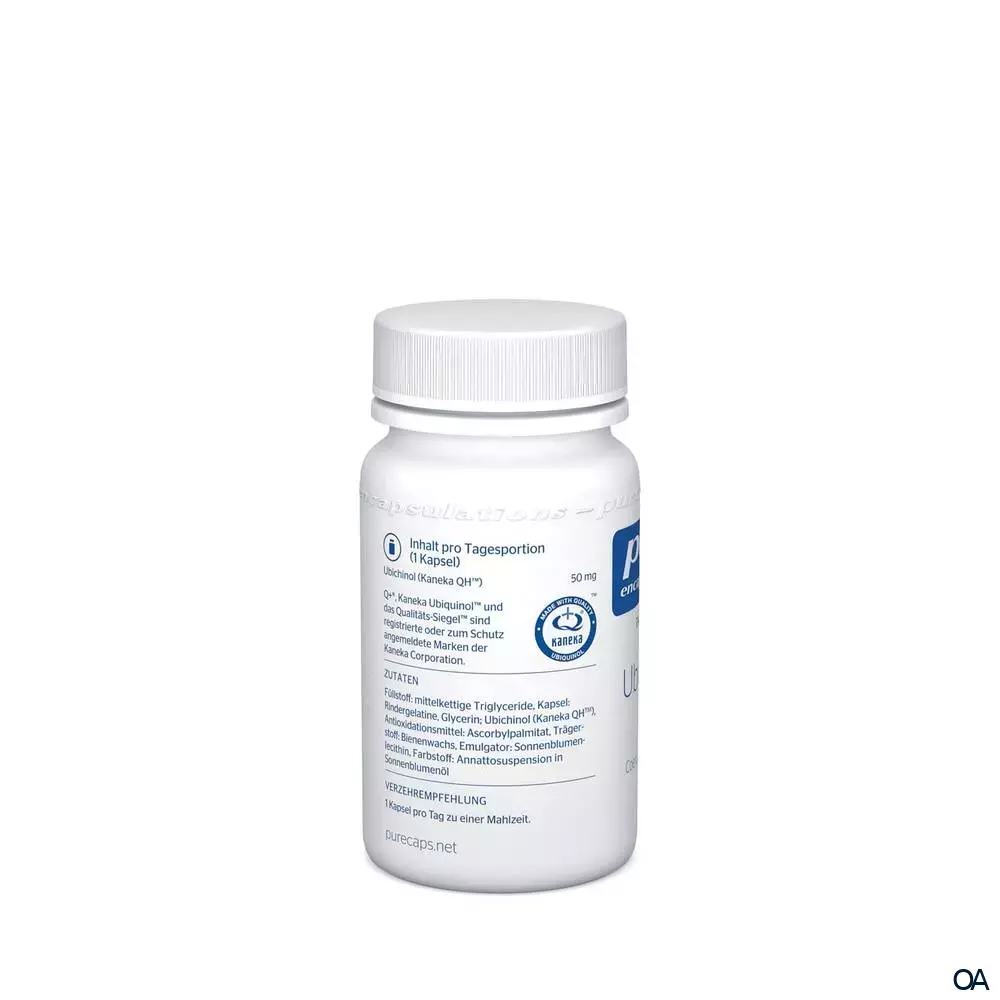- Zutaten: Füllstoff: Mittelkettige Triglyceride, Kapsel: Gelatine, Glycerin, Ubichinol (Kaneka QH™), Antioxidationsmittel: Ascorbylpalmitat, Trägerstoff: Bienenwachs, Emulgator: Sonnenblumenlecithin, Farbstoff: Annattosuspension in Sonnenblumenöl.