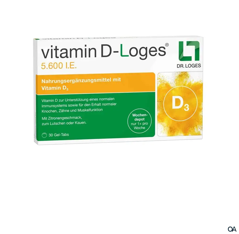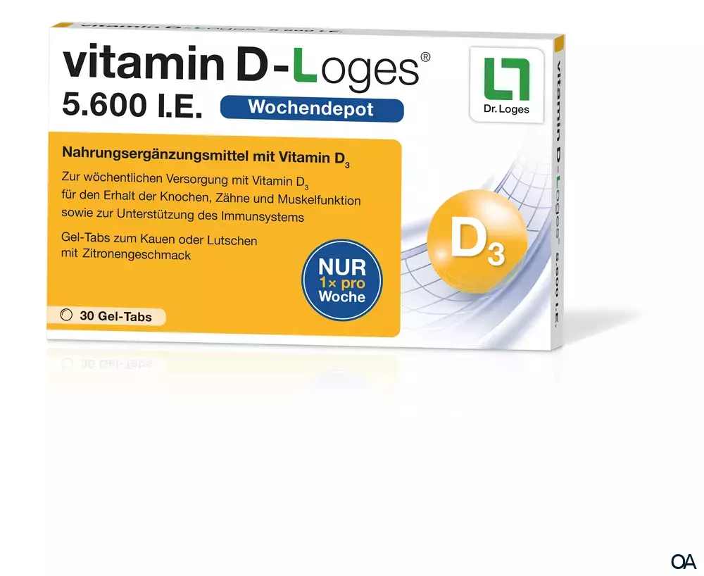 vitamin D-Loges® 5.600 I.E. Gel-Tabs ist ein Nahrungsergänzungsmittel mit Vitamin D3. Zur wöchentlichen Versorgung mit Vitamin D3 für den Erhalt der Knochen, Zähne und Muskelfunktion sowie zur Unterstützung des Immunsystems.